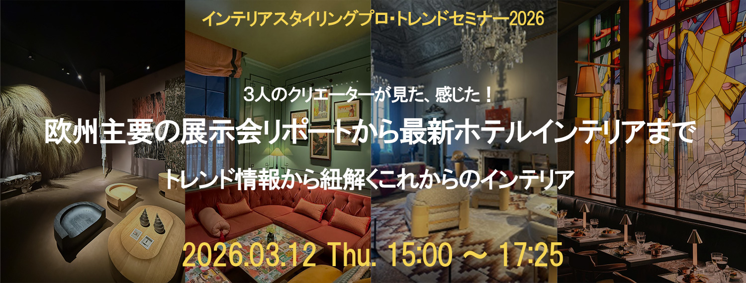 視点の異なるデザイナーによる多角的なリポートが好評のスタイリングプロ・トレンドセミナーは、今年で12回目を迎えます。2026年も、長年にわたりヨーロッパの展示会や最新ホテルを視察し、独自の分析と解説に定評のある3人のクリエーターが登壇します。 欧州主要都市で開催されたトレンドショー、各エディターの最新情報、そして現地で体感したホテルインテリアの潮流まで。豊富な視察データをもとに、3人それぞれの視点から2026年のインテリアトレンドを読み解きます。